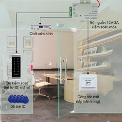 Bộ kiểm soát mở khóa cửa điện từ bằng thẻ IC và mã số được thiết kế để điều khiển mở khóa chốt điện từ. Sản phẩm bao gồm: Bộ kiểm soát mở khóa chốt cửa điện từ bằng thẻ IC, 05 thẻ IC và công tắc EXIT (để mở cửa từ bên trong).