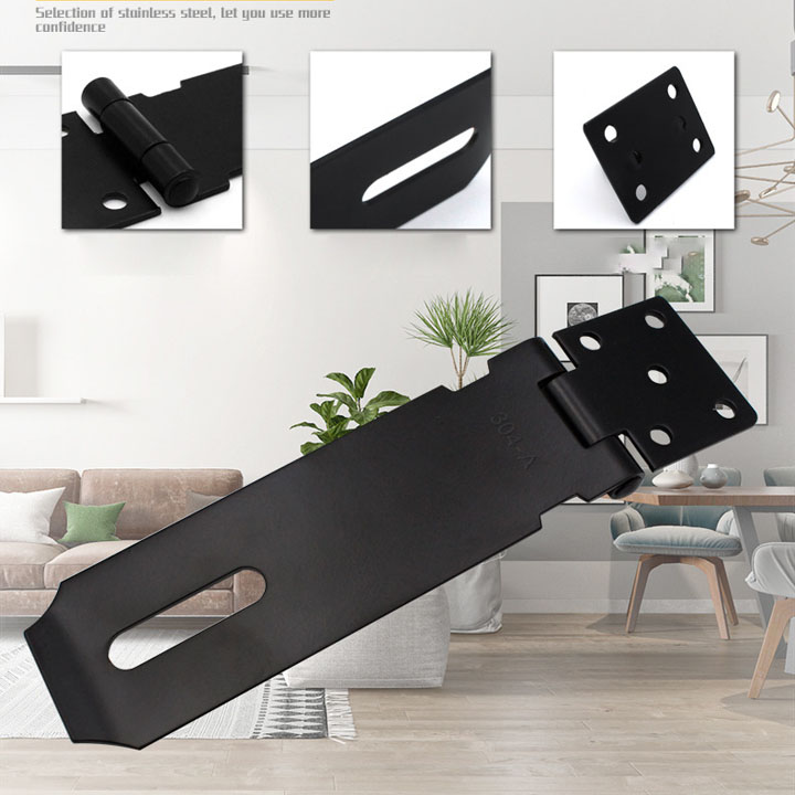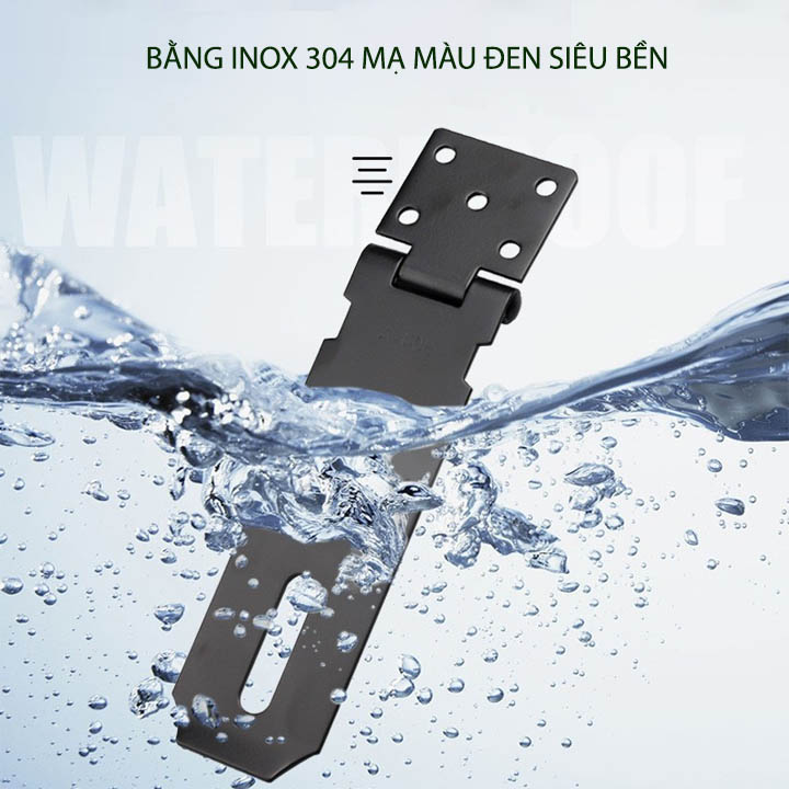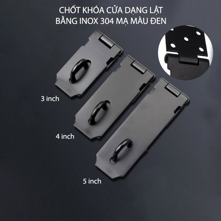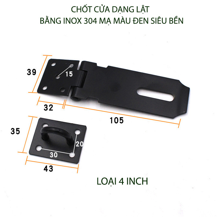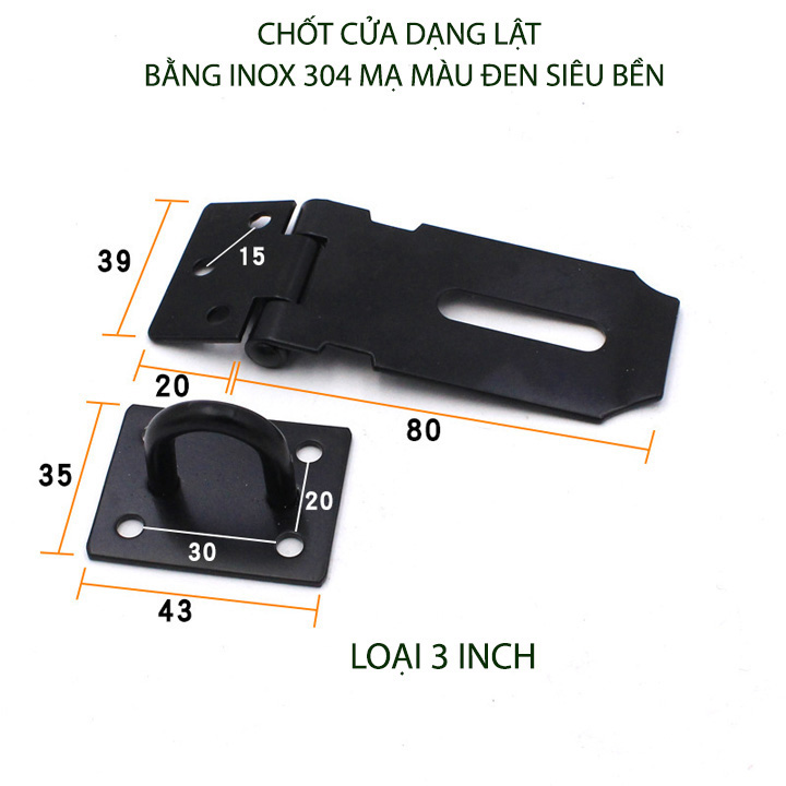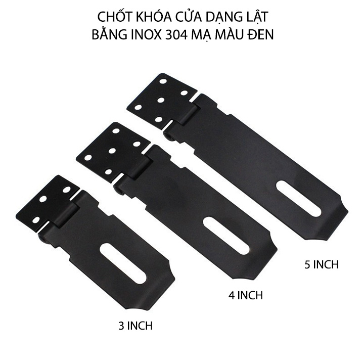 Chốt khóa cửa kiểu lật được thiết kế chắc chắn với kiểu lật có móc để khóa. Sản phẩm được làm bằng inox 304 mạ màu đen dày 1.8-2mm siêu bền. Dùng khóa cửa, khóa hòm, khóa tủ hay tự chế khóa cửa cuốn rất bền và an toàn