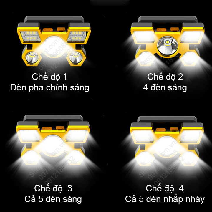 Đèn có 4 chế độ chiếu sáng: Chế độ chỉ sáng đèn lớn ở giữa; chế độ sáng đèn 4 đèn xung quanh; Chế độ cả 5 đèn và chế độ nhấp nháy cả 5 đèn (chế độ khẩn cấp)