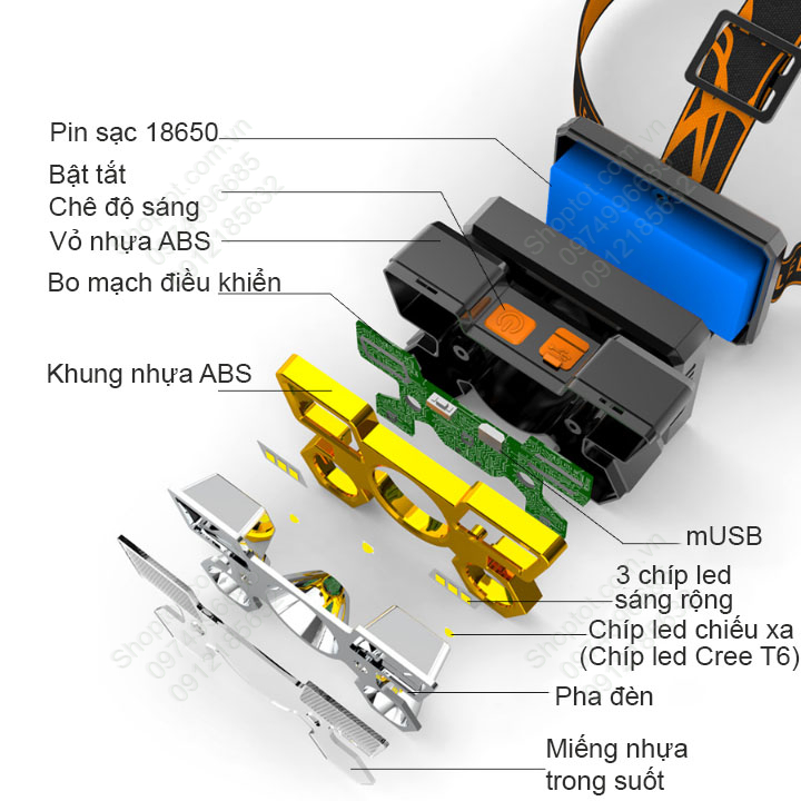 Thiết kế nhỏ gọn, nhẹ, siêu bền, dùng đội đầu; Đèn trang bị 5 bóng led (pha led) với 9 chip led Cree siêu sáng, siêu bền; Đèn trang bị pin sạc Lithium 18650-3.7V gắn sẵn bên trong
